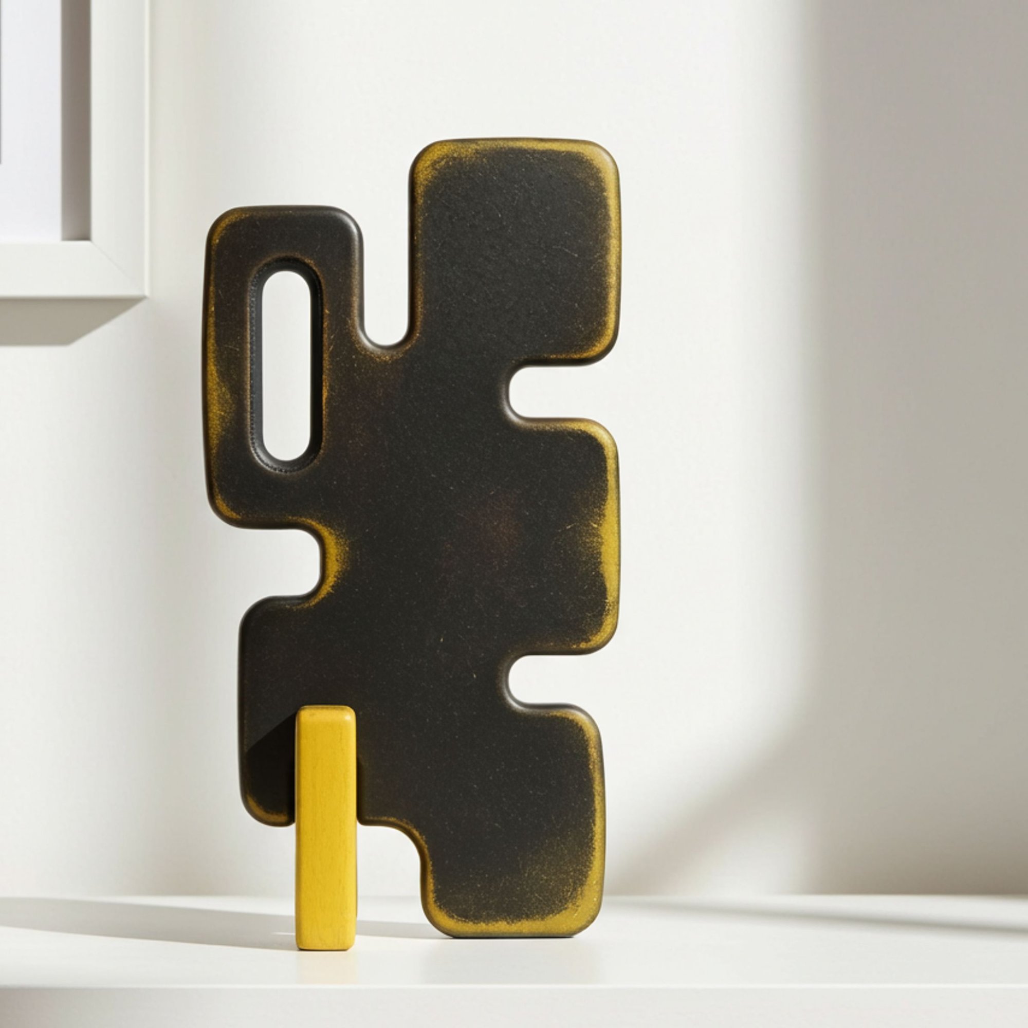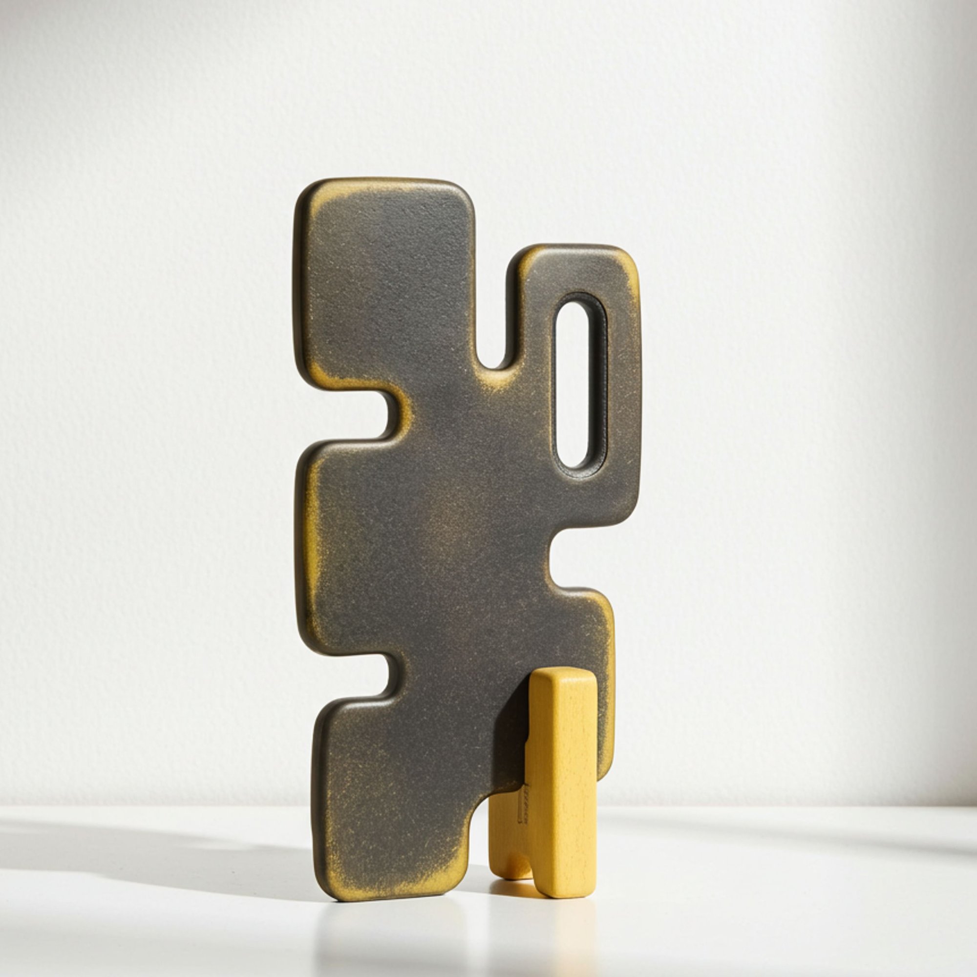 This edition is entirely unique. Its surface bears a singular patina, hand-dyed in layered tones of yellow ocher and black. The finish evokes erosion and memory, as if the object had weathered time rather than emerged from it.