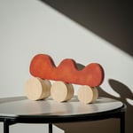 Color flows through the fibreboard like sediment or flame, grounding the piece in texture and time. The chestnut wheels offer contrast - natural, tactile, still.