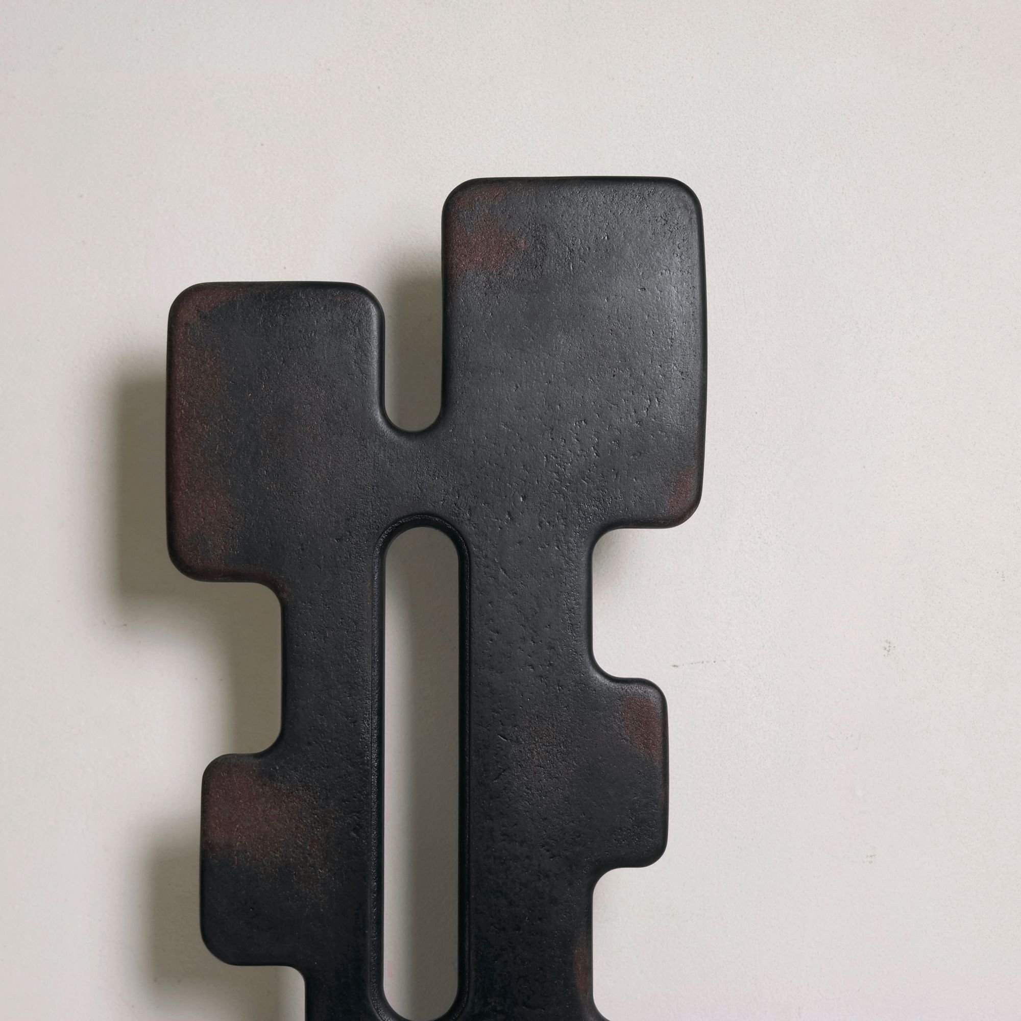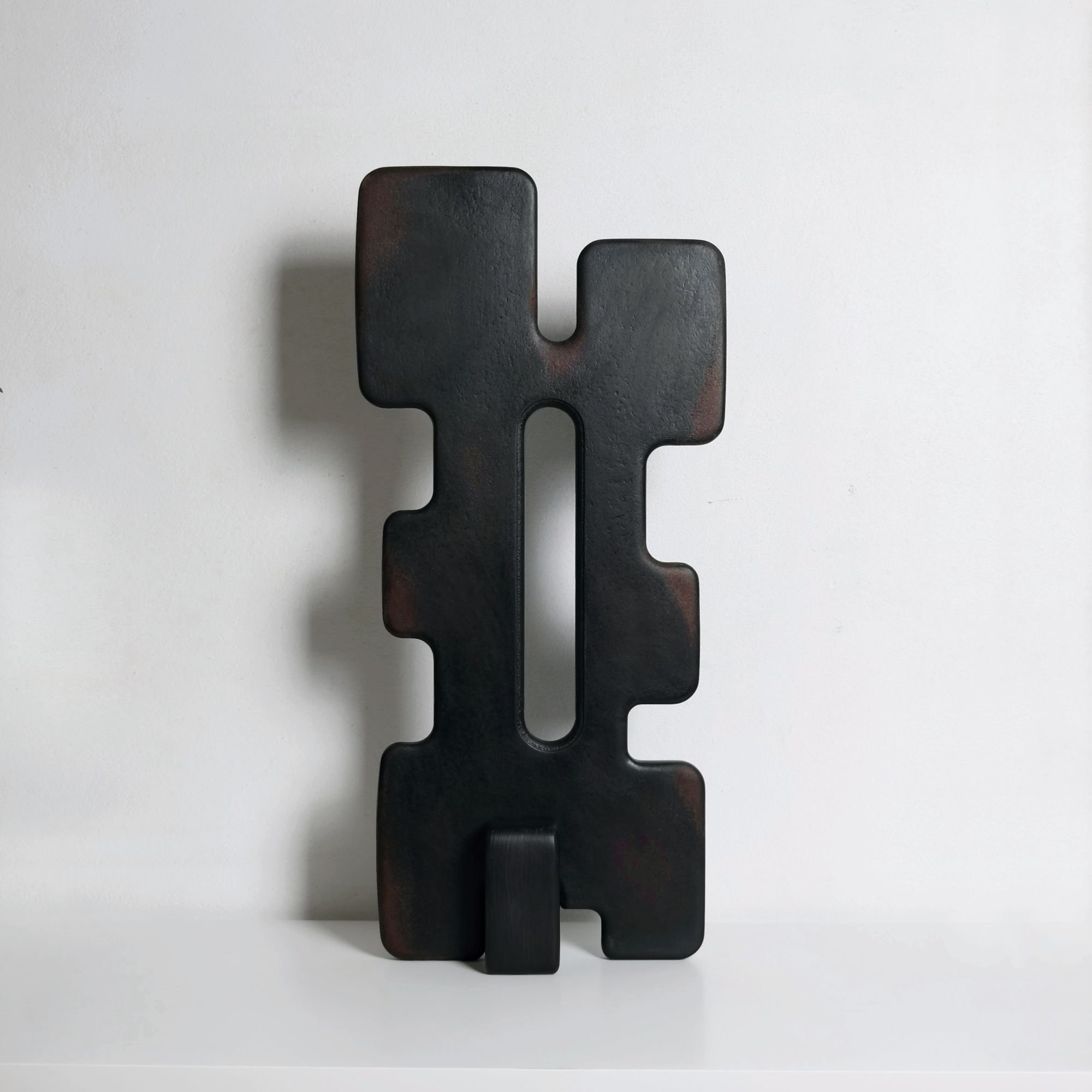 TREZE is a large tabletop sculpture with a stark yet bold presence. This statement piece has a fascinating interplay between geometric precision and organic fluidity. While its form is rooted in structured geometry, the flowing contours and textured distressed surface give it an organic feel. It’s almost like a fusion - where mathematical rules shape the foundation, but the final aesthetic evokes something natural and freeform.